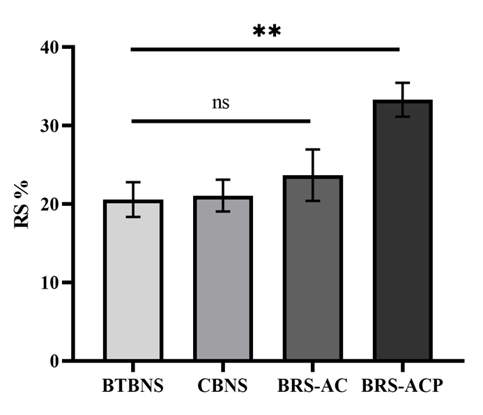 Fig. 1. Resistant starch content of BTBNS, CBNS, BRS-AC and BRS-ACP starches. BTBNS, black Tartary buckwheat native starch; CBNS, common buckwheat native starch; BRS-AC, black Tartary buckwheat resistant starch subjected to autoclaving treatment; BRS-ACP, black Tartary buckwheat resistant starch subjected to autoclaving-pullulanase combined treatment.