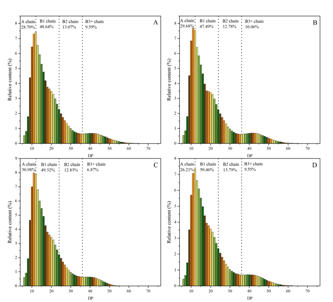Fig. 2. chain length distributions of BTBNS, CBNS, BRS-AC and BRS-ACP starches. A, BTBNS, black Tartary buckwheat native starch; B, CBNS, common buckwheat native starch; C, BRS-AC, black Tartary buckwheat resistant starch subjected to autoclaving treatment; D, BRS-ACP, black Tartary buckwheat resistant starch subjected to autoclaving-pullulanase combined treatment. A chain, the rate of DP range from 6-12 in chain length distributions; B1 chain, the rate of DP range from 13-24 in chain length distributions; B2 chain, the rate of DP range from 25-36 in chain length distributions; B3+ chain, rate of DP ≥ 37 in chain length distribution; DP, average degree of polymerization.