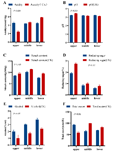 通常,在浓香型白酒生产过程中发酵糟醅会产生黄水。黄水在重力的作用下将风味化合物、营养物质与微生物带到窖池下层,导致底部的糟醅更多的受益于菌群的发酵代谢与丰富的风味滋养,而在上层发酵糟醅则由于挥发性酸和合成己酸乙酯的微生物数量不足,导致风味化合物,尤其是己酸乙酯的含量较少。因此,酒糟在窖池中的空间位置决定了其原酒的质量等级,底层酒糟中的原酒质量往往高于上层糟醅的原酒。为了解决浓香型白酒上层糟醅质量偏低的技术难题,课题组从酿酒材料中挖掘了3株功能菌,即Clostridium butyricum, Rummeliibacillus suwonensis和 Issatchenkia orientalis,将其混合发酵制成强化微生物菌剂投入至上层糟醅中进行强化发酵,并对其理化、微生物组、风味化学等采用CCA、Pearson相关性网络等技术分析其复杂的相互作用关系,研究结果显示白酒酯类和醇类化合物含量整体得到提升;温度、氧气和酸度影响了微生物的群落组成;Caldicoprobacter、Caproiciproducens、Delftia、Hydrogenispora、Thermoactinomyces、Issatchenkia Bacillus和Aspergillus对白酒关键风味化合物的生成呈现正相关关系。实验组己酸乙酯在原酒中的含量比对照组明显提高,上层和下层分别从1829mg/L增加到2084mg/L,3902mg/L增加到4678mg/L。乙酸乙酯在强化发酵后的糟醅与对照组相比含量则整体减少,同时丁酸乙酯的含量却显著提高。这些结果表明生物强化是提升白酒质量和馥郁度的一种重要技术手段,在提升己酸乙酯的同时,还协同控制了乙酸乙酯的含量,有效解决了目前很多酒厂出现的乙酸乙酯偏高的问题,这为我们后续研究白酒的风味改善提供了一种新的途径和思路。