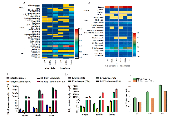 Fig. 4. A comparison between the flavor compounds in the FG and distilled baijiu before and after inoculation. The heatmap of the flavor compounds in the FG (A) and distilled baijiu (B). Changes in the ethyl hexadecanoate (C), ethyl acetate (D), and ethyl butyrate (E) in the samples. Yellow areas in the heatmaps indicated that the substance was not detected in the samples.