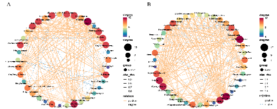 Fig. 6. The correlation between the microbial communities and flavor compounds via network correlation analysis of the FG (A) and baijiu (B).