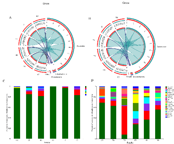 Fig. 3. The distribution of the bacteria (A) and fungi (B) at the phylum level in the FG and the changes in the primary bacteria (C) and fungi (D) in the samples at the genus level (P<0.05).