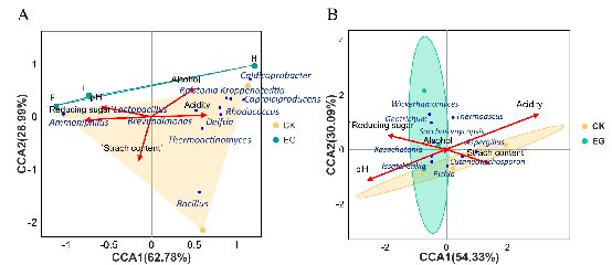 Fig. 5. The CCA analysis of the correlation between the microbial communities (bacteria A, fungi B) and physicochemical environment at the genus level(P<0.05).