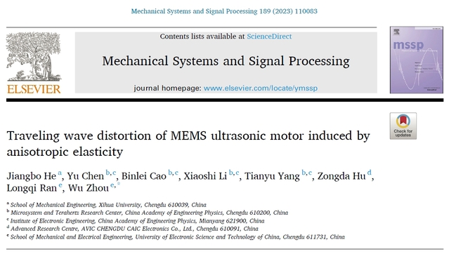 近期,机械工程学院装备智能设计与方法科研团队何江波副教授在国际知名期刊《MECHANICAL SYSTEMS AND SIGNAL PROCESSING》发表题为“Traveling wave distortion of MEMS ultrasonic motor induced by anisotropic elasticity”的研究论文。何江波副教授为论文的第一作者,2138cn太阳城集团为论文的第一完成单位,合作单位包括电子科技大学和中国工程物理研究院微系统与太赫兹研究中心。