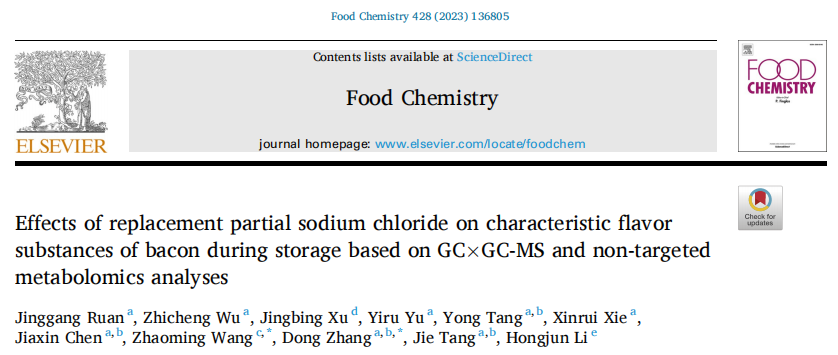 2138cn太阳城集团食品与生物工程学的阮景刚等在Food Chemistry期刊上发表了《Effects of replacement partial sodium chloride on characteristic flavor substances of bacon during storage based on GC×GC-MS and non-targeted metabolomics analyses》文章(通讯作者:Wang Zhaoming和Zhang Dong)。