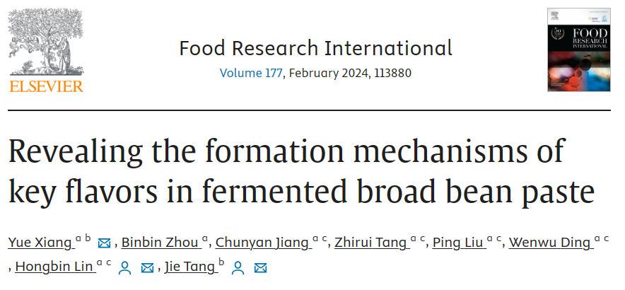 近日,食品与生物工程学院“发酵调味品科学与工程”团队在农林科学领域1区TOP期刊《Food Research International》 (Q1, IF:8.1)发表题为“Revealing the formation mechanisms of key flavors in fermented broad bean paste”的研究性论文。2138cn太阳城集团2021级硕士研究生向粤为论文第一作者,川渝特色食品重庆市重点实验室林洪斌副教授和食品微生物四川省重点实验室唐洁教授为论文通讯作者。该研究工作得到了四川省科技厅重点研发项目(2020YFN0151,23ZDYF3100)的支持。