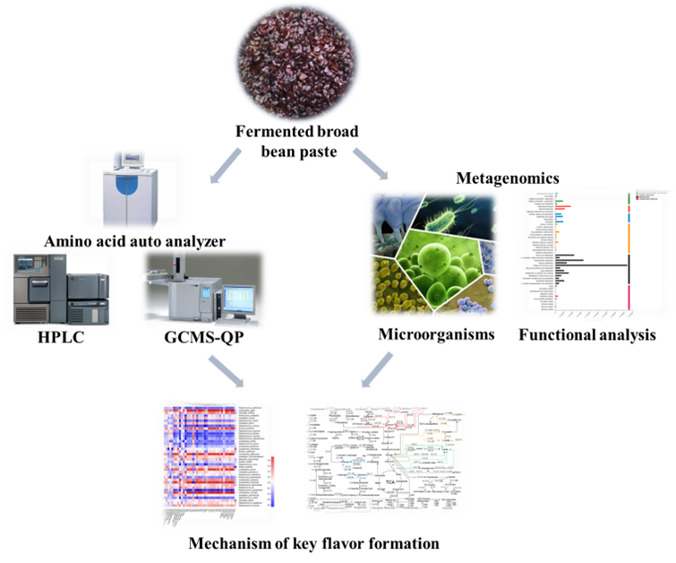 因此,本研究利用高效液相色谱(HPLC)和顶空固相微萃取-全二维气质联用(HP-SPME-GC×GC-MS)等对甜瓣子发酵过程中的风味物质(滋味物质和香气物质)进行分析,基于宏基因组学研究甜瓣子发酵过程中微生物种群组成和演替以及功能微生物,研究甜瓣子发酵过程中与关键风味物质形成相关的主要功能微生物和代谢途径,揭示甜瓣子发酵过程中关键风味物质形成机理。