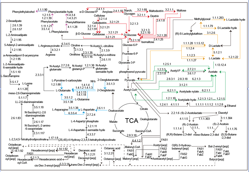 结果表明,其中鸡葡萄球菌是微生物群落中的主要微生物,占39.13%;敏捷乳杆菌次之,占13.76%;黄曲霉是相对丰度最高的真菌,占3.02%。KEGG途径富集分析表明,碳水化合物代谢和氨基酸代谢是主要的代谢途径。糖苷水解酶和糖基转移酶基因最为丰富,占活性酶基因总数70%以上。共注释了113种与关键风味相关的酶,以及39种与酶相对应的微生物。其中,鸡葡萄球菌、敏捷乳杆菌、融合魏斯氏菌、乳酸片球菌、克氏葡萄球菌、米曲霉和黄曲霉在代谢途径中发挥了关键作用。该研究揭示了发酵蚕豆中关键风味的形成机理,对指导郫县豆瓣生产的品质控制具有重要意义。