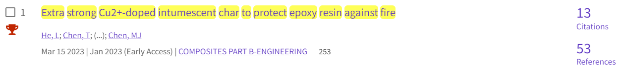 近日,理学院陈明军教授带领的功能高分子材料绿色制备与循环利用研究团队取得阻燃剂绿色合成与应用研究新进展。光催化连续流技术绿色合成阻燃剂的研究工作,发表在化学领域主流刊物Organic Chemistry Frontiers (中科院1区TOP,IF: 5.4)上,且被评为当期封面文章进行亮点介绍,该工作第一作者为理学院符志成博士,通讯作者为陈明军教授,得到了重庆邮电大学李经方老师和北京化工大学杨占会老师的指导;铜离子掺杂膨胀阻燃抑烟环氧树脂的研究工作发表在材料科学领域主流刊物Composites Part B-Engineering (中科院1区TOP,IF: 13.1)上,并入选ESI高被引论文 (见图2), 该工作第一作者为理学院2019级硕士研究生何磊,通讯作者为汪婷副教授和陈明军教授;与四川大学王玉忠院士合作完成的新型环状磷酸酯高阻燃聚氨酯的研究工作,发表在化工领域顶级刊物Chemical Engineering Journal (中科院1区TOP,IF: 15.1)上,该工作的第一作者为理学院符志成博士,通讯作者为王玉忠院士和陈明军教授 (见图3)。