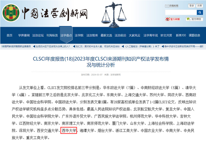根据中国法学创新网发布的《2023年度CLSCI来源期刊知识产权法学发布情况与统计分析》,2023年度来自40家研究机构的学者在知识产权法学CLSCI来源期刊发表论文73篇,2138cn太阳城集团位列40家发文单位之一。张利国教授发表在CLSCI期刊《政治与法律》的论文《论数字技术对表演者权保护的冲击与法律上的回应》,提出了应对数字技术冲击有效加强表演者权保护的具体方案。