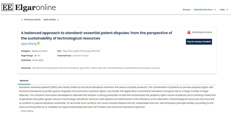 近日,我校法学与社会学学院张利国教授在国际知识产权一流期刊Queen Mary Journal of Intellectual Property 2024年第1期发表了学术论文“A balanced approach to standard-essential patent disputes: from the perspective of the sustainability of technological resources”,该文分析了解决专利与技术标准冲突的两种方案,指出这两种方案都不利于技术资源的配置效率,进而提出法律解释要维护标准必要专利权利人与技术标准实施者之间的平等关系,促进当事人自愿达成专利许可协议的解决方案。