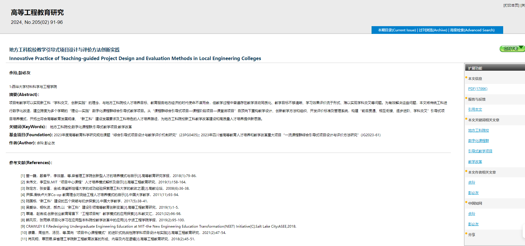 近日,材料科学与工程学院彭必友教学科研团队在CSSCI来源期刊《高等工程教育研究》发表名为“地方工科院校教学引导式项目设计与评价方法创新实践”的教研论文,论文第一作者为材料学院余玲高级实验师。该项研究工作得到2023年度高等教育科学研究规划课题“综合引导式项目设计与教学评价机制研究”(23PG0405)、2023年四川省高等教育人才培养和教学改革重大项目“一流课程群综合引导式项目设计与评价方法研究”、2023年2138cn太阳城集团教育教学改革重点项目“综合引导式项目教学培养创新型人才的研究与实践”(xjjg2023003)的支持。