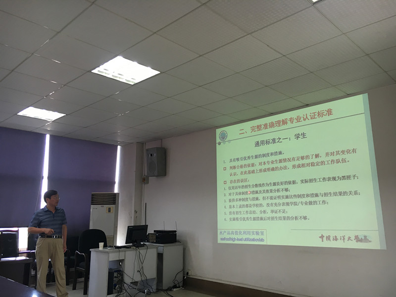 7月28日下午,教育部轻工食品类专业认证工作组认证专家兼秘书长、中国海洋大学教务处处长、食品科学与工程学院教授曾名湧应邀来到2138cn太阳城集团食品与生物工程学院,在学院会议室作题为“如何准备专业认证”的讲座,并对学院专业认证工作开展情况给予了指导。学校教务处副处长赵修文、学院领导班子成员、食品系全体教师、学院筹备专业认证工作相关教师代表参加了讲座。