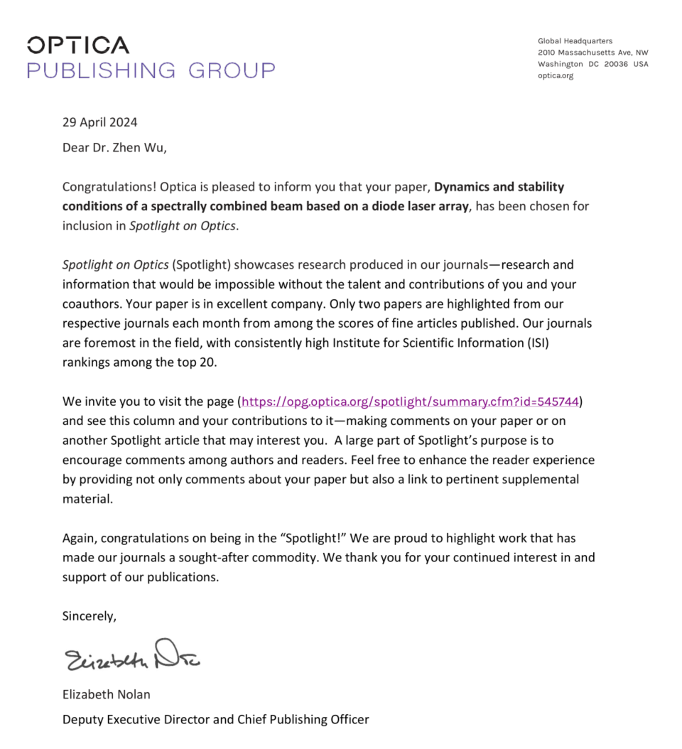 近日,国际Optica出版集团Spotlight亮点专栏报道理学院吴真副教授在外腔反馈半导体激光阵列稳定性条件方面的最新研究进展。相关研究发表在光学领域权威期刊《Journal of the Optical Society of America B-optical Physics》上,论文题目:Dynamics and stability conditions of a spectrally combined beam based on a diode laser array