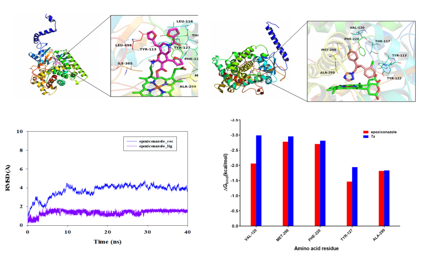 最后,利用计算机模拟技术对小分子与靶蛋白进行了分子作用机制研究。分子对接研究结果表明化合物7a具有比阳性对照更强的亲和力,分子动力学模拟表明目标化合物具有比阳性对照更强的∆Gbind(kcal/mol),如图3所示。这些结果表明该类化合物可能是一类具有潜在商业价值的生物活性候选药物,将来可能作为潜在商业化的DMIs。