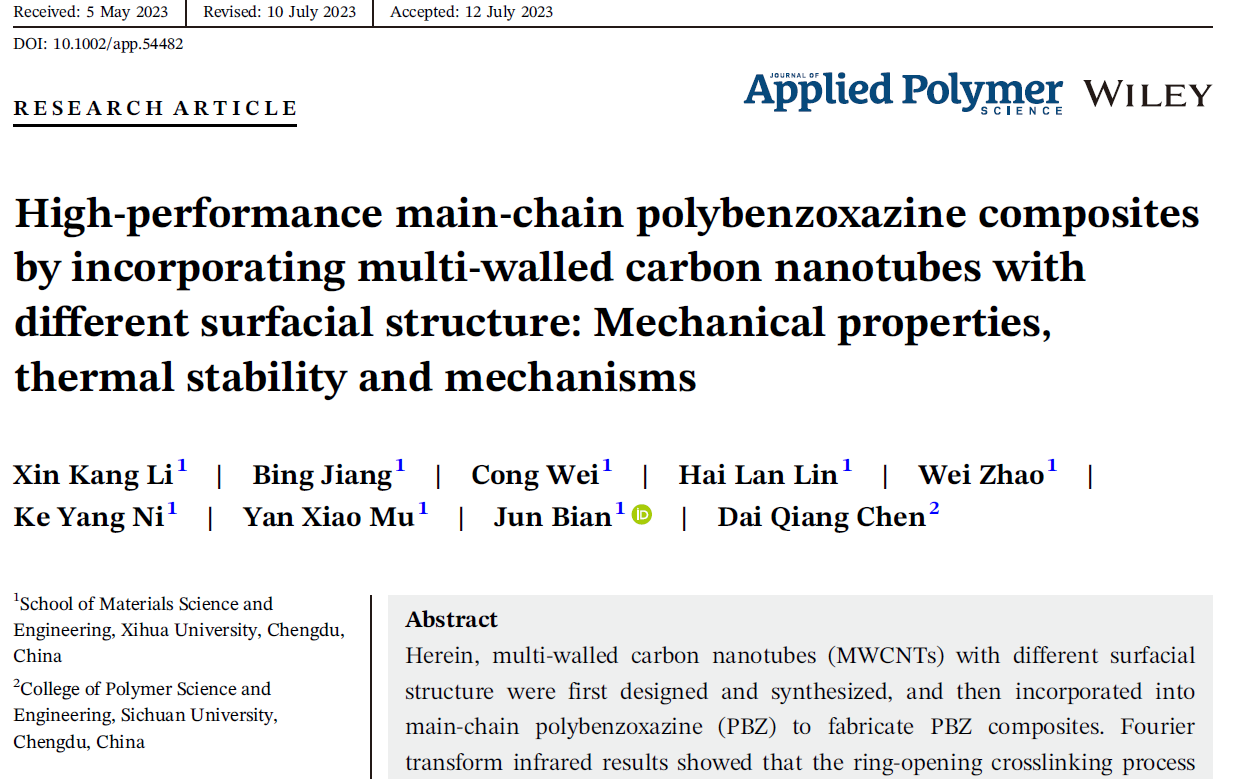 此前,本课题组已经在国际知名期刊Journal of Applied Polymer Science和Polymer Composites上发表了关于PBZ及其复合材料相关的研究性论文3篇,分别是“Simulation, design and synthesis of polybenzoxazine with different main-chain structures and properties: A comparative study”
