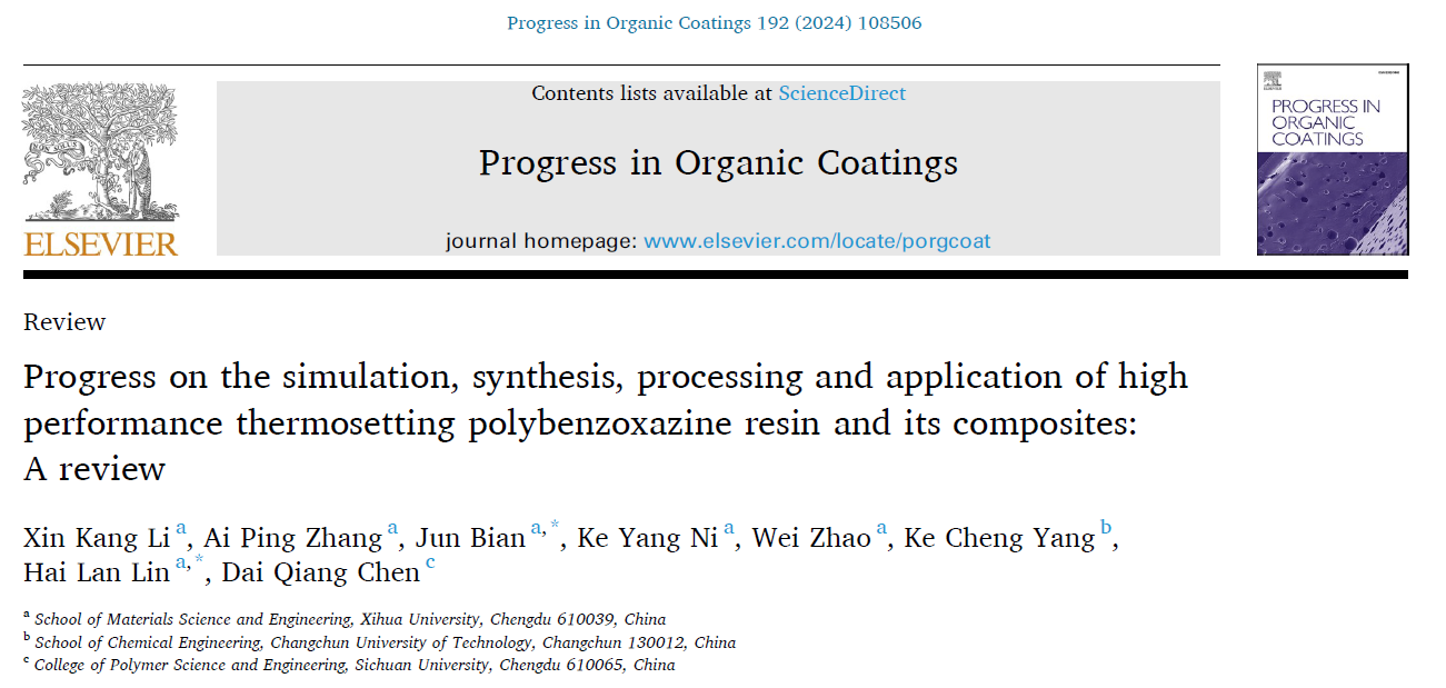 近日,材料科学与工程学院在国际知名期刊Progress in Organic Coatings上发表高水平Review论文。论文题目为“Progress on the simulation, synthesis, processing and application of high performance thermosetting polybenzoxazine resin and its composites: A review”。卞军教授为通讯作者,2021级硕士研究生李鑫康为第一作者。该研究工作得到了教育部春晖计划合作项目及重点实验室开放基金等项目的资助。