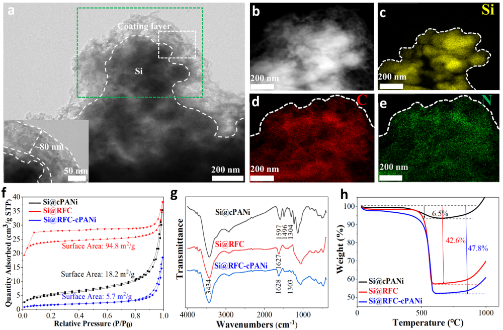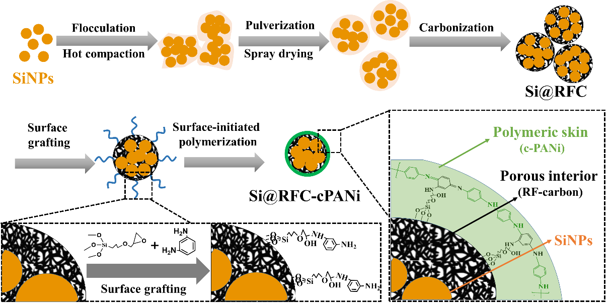 此工作通过絮凝沉淀、热压实、喷雾干燥、表面引发聚合等过程,实现了导电交联聚苯胺(c-PANi)在多孔硅碳颗粒上的均匀附着,制备的双包覆层Si-C颗粒(Si@RFC-cPANi)具有低比表面积(5.7 m2/g)、丰富的闭孔结构(1.49 cm3/g)(图1)。