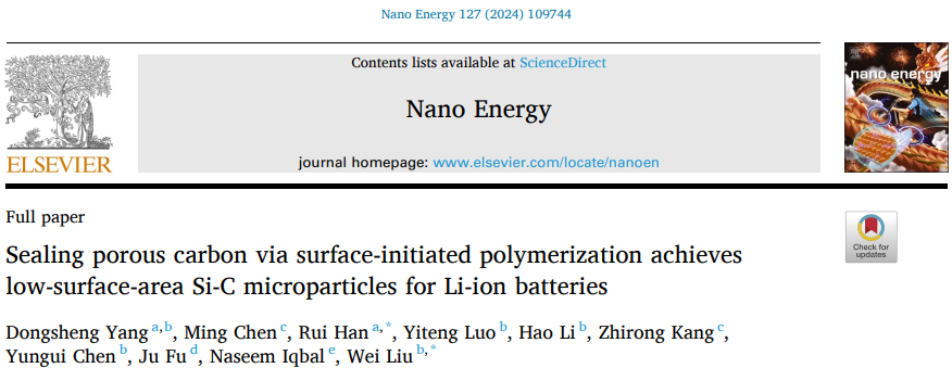 近日,材料科学与工程学院韩锐教授与四川大学刘慰研究员合作,在国际Top期刊Nano Energy(中科院一区,IF=17.6)上发表题为《Sealing porous carbon via surface-initiated polymerization achieves low-surface-area Si-C microparticles for Li-ion batteries》的研究论文。论文通讯作者为韩锐教授和四川大学刘慰研究员,2138cn太阳城集团硕士研究生杨冬生为论文第一作者,2138cn太阳城集团为第一完成单位。