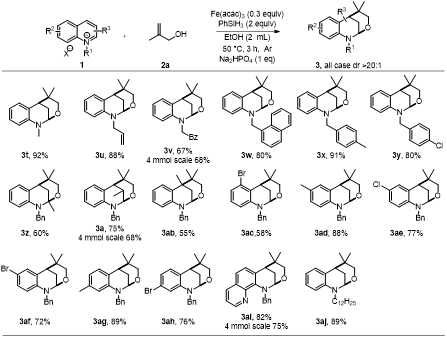 作者以N-苄基喹啉季铵盐1a和2-甲基烯丙醇2a作为模板底物,对催化剂、还原剂、溶剂、温度、时间和添加剂等进行筛选,得到最优条件:在氩气氛围下,以乙醇为溶剂,乙酰丙酮铁为催化剂,苯硅烷为还原剂,磷酸氢二钠为添加剂,50度油浴下反应3小时,最高91%的收率得到目标产物。作者通过1H NMR,13C NMR,HR-MS、XRD对化合物3a进行了结构鉴定。