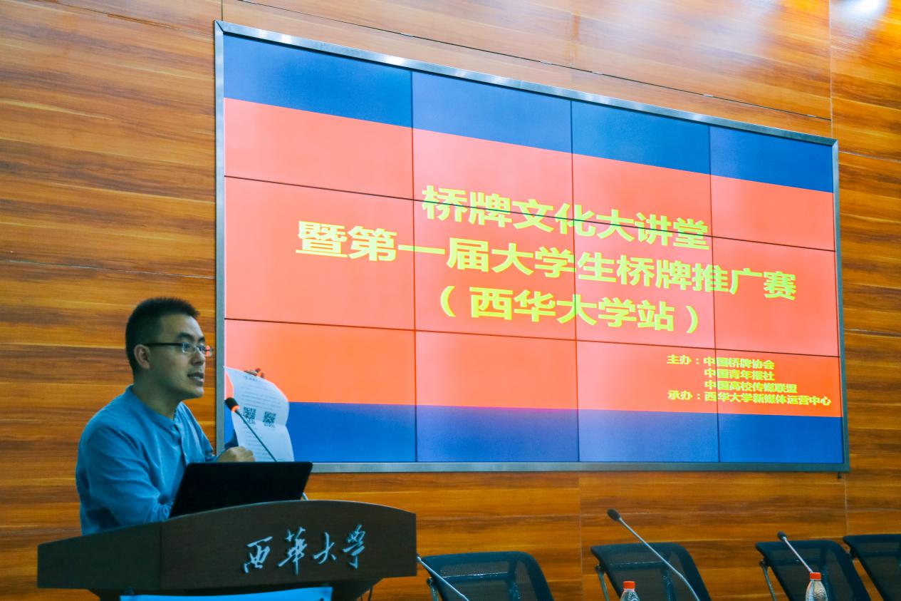 10月19日晚7点,由中国桥牌协会、中国青年报社、中国高校传媒联盟共同主办的桥牌文化大讲堂在我校图书馆报告厅拉开帷幕,200多名爱好桥牌的在校学子参与了此次活动。世界桥牌锦标赛冠军周涛,中国桥牌终身大师、天津桥牌协会秘书长伍岷,中国桥牌协会副秘书长王艳楠、《中国体育报》副总编陈君,四川省桥牌协会副秘书长李石林等众多桥牌界权威人士莅临我校并出席活动现场。