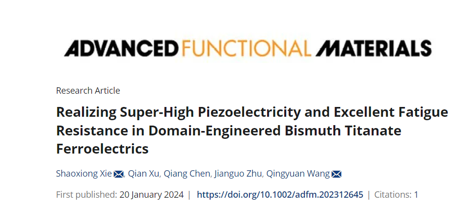 近日,建筑与土木工程学院力学教学部及力学实验中心徐倩博士(共同一作)与日本JSPS研究员谢少雄博士的合作论文《Realizing Super‐High Piezoelectricity and Excellent Fatigue Resistance in Domain‐Engineered Bismuth Titanate Ferroelectrics》在国际TOP期刊Advanced Functional Materials(IF:19.0)发表。Advanced Functional Materials 是顶级材料科学期刊,主要关注于改善材料化学和物理性能相关的突破性研究。