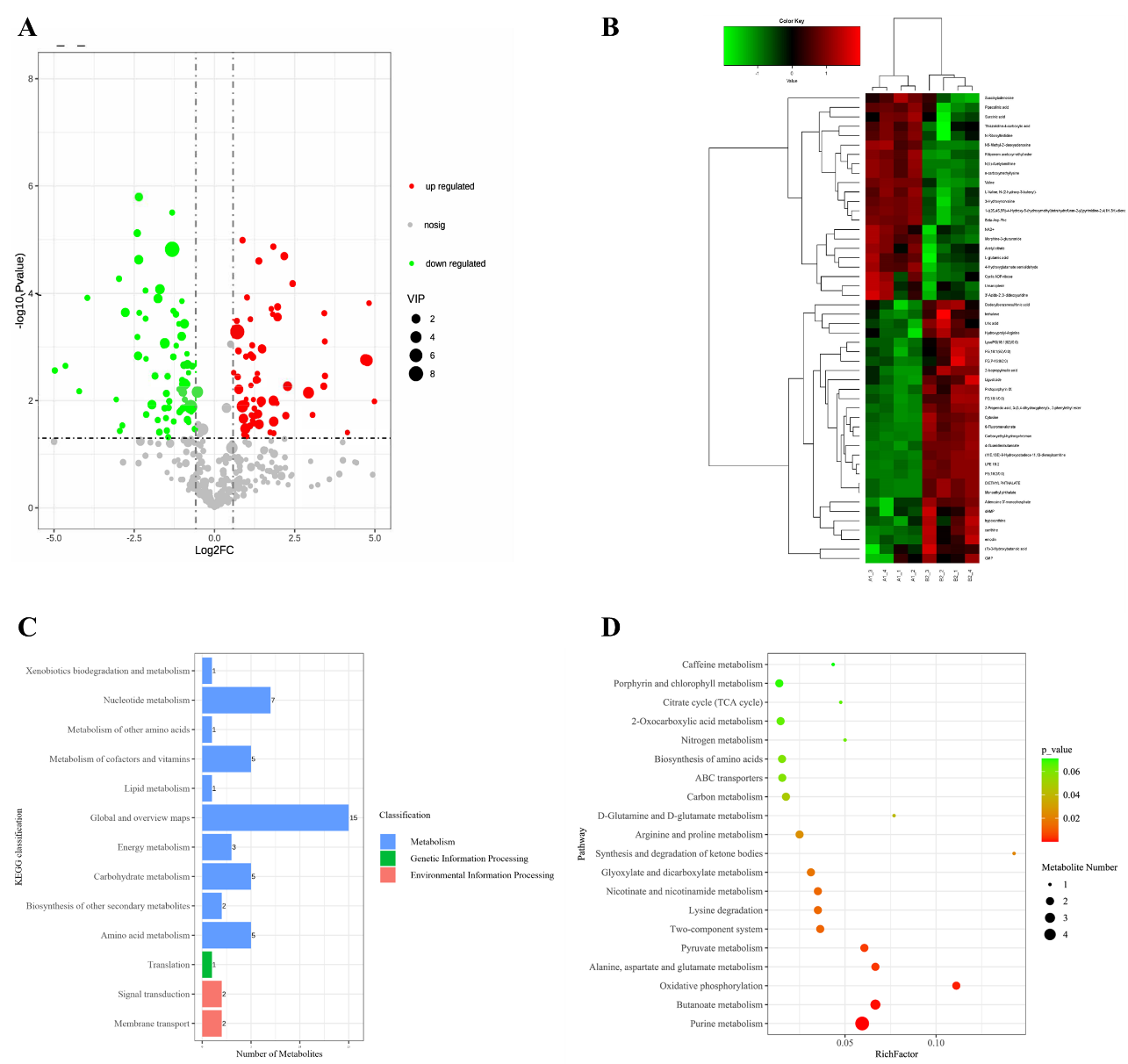 图 3 (A) 差异代谢物火山图;(B) 差异代谢物聚类热图;(C) KEGG 代谢通路层次分类图;(D) KEGG 通路富集分析气泡图