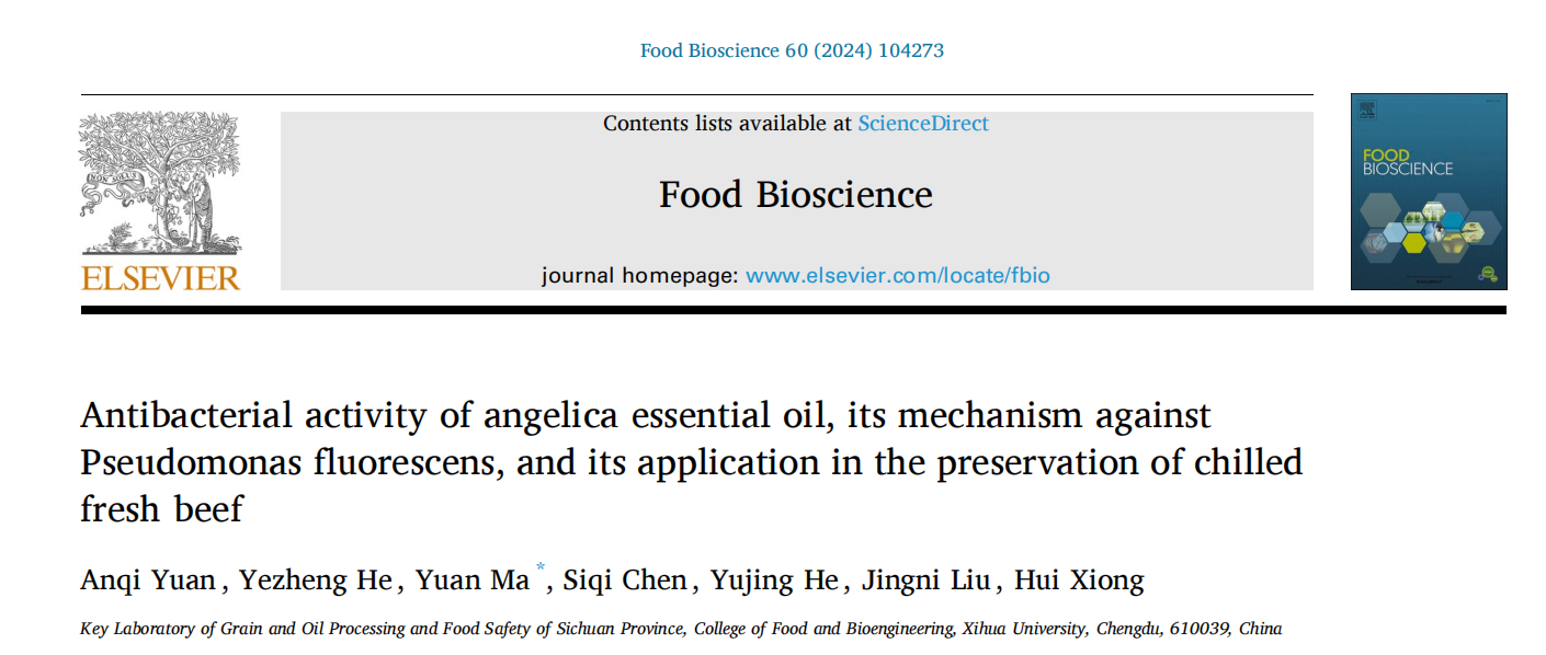 近日,食品与生物工程学院马嫄教授课题组在1区TOP期刊Food Bioscience(Q1,IF: 5.2)发表题为“Antibacterial activity of angelica essential oil, its mechanism against Pseudomonas fluorescens, and its application in the preservation of chilled fresh beef”的研究性论文。该文第一作者为研究生袁安琪,通讯作者为马嫄教授。