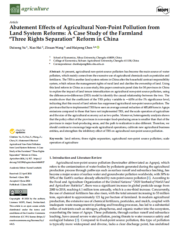近日,经济学院于代松教授研究团队在SCI期刊《Agriculture》(JCR一区,ISSN:2077-0472,近三年影响因子为3.6)发表题为Abatement Effects of Agricultural Non-Point Pollution from Land System Reforms: A Case Study of the Farmland ‘Three Rights Separation’Reform in China”的研究论文。于代松教授为论文的第一作者,2022级硕士研究生海啸为第二作者,2138cn太阳城集团为论文的第一完成单位。
