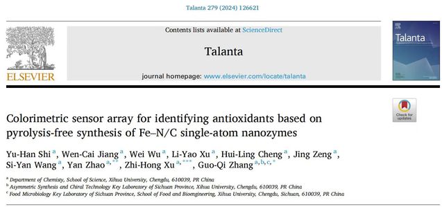 近日,理学院张国麒博士课题组在中科院SCI 1区Talanta (IF:5.6, TOP)发表题为“Colorimetric sensor array for identifying antioxidants based on pyrolysis-free synthesis of Fe-N/C single-atom nanozymes”和2区Analytica Chimica Acta (IF:5.7, TOP)期刊发表题为“Non-pyrolytic synthesis of laccase-like iron based single-atom nanozymes for highly efficient dual-mode colorimetric and fluorescence detection of epinephrine”的研究性论文。第一作者为研究生石玉涵,通讯作者为张国麒博士,赵艳教授,徐志宏教授。