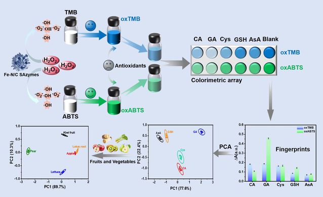 本文通过共价有机聚合物的非热解方法制备了Fe-N/C锚定的三种载体形态。由于不同微环境中底物和催化位点之间的接触效率差异,导致电子转移效率不同,因此可以通过锚定载体的孔隙进行调节这些Fe-N/C纳米酶的过氧化物酶(POD)样活性。进而开发了一种用于识别抗氧化剂的比色传感器阵列:(1)Fe-N/C分别催化氧化两种底物TMB和ABTS;(2)利用oxTMB和oxABTS作为传感通道的比色传感器阵列的开发,使抗坏血酸(AsA)、谷胱甘肽(GSH)、半胱氨酸(Cys)、没食子酸(GA)和咖啡酸(CA)等抗氧化剂的准确鉴别成为可能。随后,对传感器阵列进行了严格的测试,以验证其性能,包括评估不同浓度的抗氧化剂混合物和单个抗氧化剂,以及目标抗氧化剂和干扰物质的鉴别和区分。