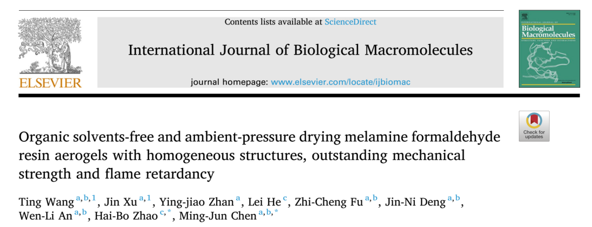 此外,创新地利用聚合物原位聚合三聚氰胺甲醛树脂的方法,成功实现兼具强度和韧性的三聚氰胺甲醛树脂的合成,实现无溶剂置换的常压干燥法制备高强度本征阻燃的三聚氰胺甲醛树脂气凝胶材料。其成果发表在材料科学领域主流刊物International Journal of Biological Macromolecules (中科院1区TOP,IF: 7.7),第一作者为理学院汪婷副教授和理学院2024届化学与生物医药硕士徐津,通讯作者为四川大学赵海波教授和陈明军教授,2138cn太阳城集团为第一单位 。