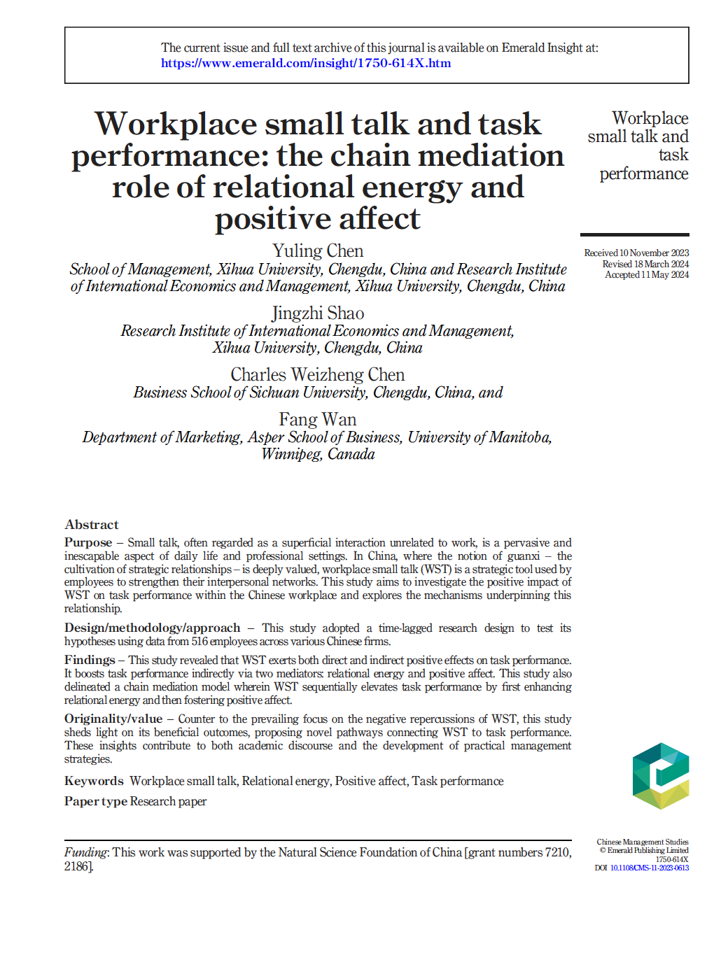 国际经济与管理研究院2022级工商管理专业硕士研究生邵婧芝主笔的文章在国际期刊《Chinese Management Studies》(SSCI)发表,题为“Workplace small talk and task performance: the chain mediation role of relational energy and positive affect”。陈玉玲副教授为论文的第一作者,硕士研究生邵婧芝为第二作者兼通讯作者,2138cn太阳城集团为论文的第一完成单位。该研究工作为国家自然科学基金青年基金项目(72102186)的阶段性成果之一。