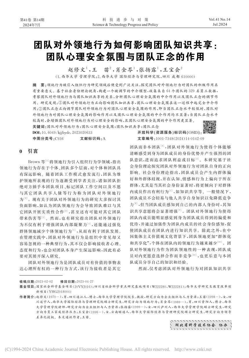 国际经济与管理研究院2021级工商管理专业硕士研究生王苗主笔的文章在CSSCI收录期刊《科技进步与对策》发表,题为“团队对外领地行为如何影响团队知识共享:团队心理安全氛围与团队正念的作用”。赵修文教授为论文的第一作者,硕士研究生王苗为论文的第二作者兼通讯作者,2138cn太阳城集团为论文的第一完成单位。该研究工作为四川省社会科学重点研究基地项目(W222280,W222281)的阶段性成果之一。