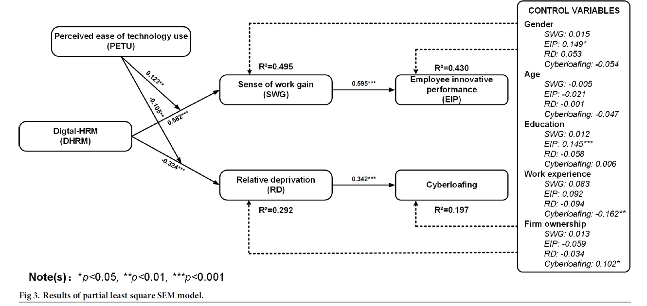 基于工作需求—资源理论,该研究深入探究了数字化人力资源管理(Digital-HRM)对员工的创新绩效(EIP)以及网络闲逛行为(Cyberloafing)的影响,并探究了工作获得感(SWG)和相对剥夺感(RD)在其中的中介作用以及感知技术易用性(PETU)的调节作用。研究采用定量研究方法,通过三个时点进行线上问卷调查来收集研究数据(N = 487)。采用SmartPLS、SPSS以及Mplus对研究数据进行统计分析,以检验和验证假设。