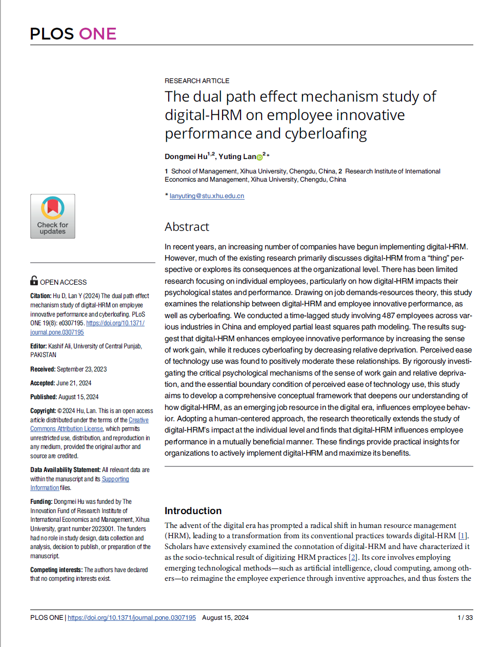 国际经济与管理研究院2022级工商管理专业硕士研究生蓝雨婷主笔的文章在国际期刊《PLOS ONE》(JCR一区)发表,题为“The dual path effect mechanism study of digital-HRM on employee innovative performance and cyberloafing”。胡冬梅教授为论文的第一作者,硕士生蓝雨婷为论文的第二作者兼通讯作者,2138cn太阳城集团为论文的第一完成单位。