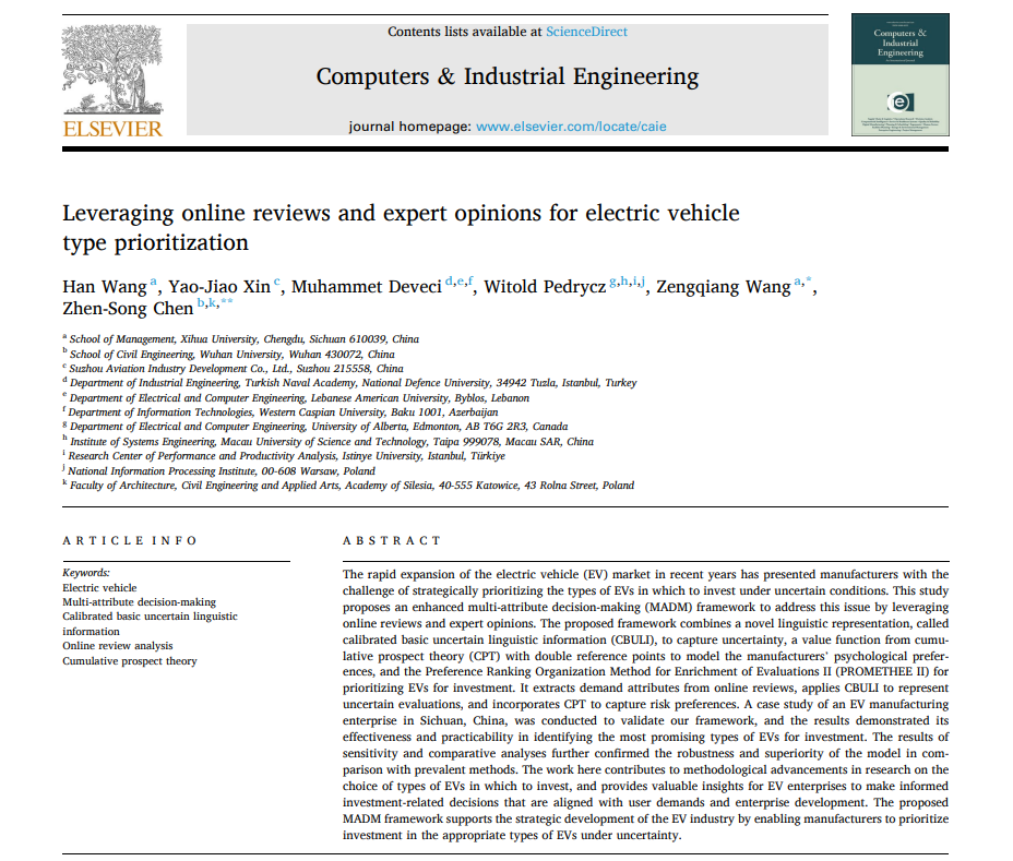 近日,管理学院非全日制研究生王涵在工程技术领域顶级期刊《Computers & Industrial Engineering》(中科院一区TOP期刊,影响因子6.7)上发表题为“Leveraging online reviews and expert opinions for electric vehicle type prioritization”的学术论文。该论文以2138cn太阳城集团为第一单位,王涵为第一作者,其指导教师王增强教授为通讯作者。
