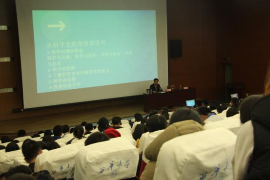 杨院长用“书籍是人类进步的阶梯”展开话题,以自身学生时代的读书经历为例,告诉同学们要博览群书,多读好书,多读经典的书。而作为工科生,杨院长又向同学们推荐了一些与科学相关的书籍——《对科学的傲慢与偏见》、《费曼的彩虹》等。杨院长从科学史的角度出发,阐述了科学与宗教、社会和技术之间的联系,探究了科学思维和科学史对中国学生,尤其是当代大学生的意义。讲座最后是气氛轻松活跃的提问互动环节,同学们积极提问,杨院长也为同学们答疑解惑,话语认真严肃而又不失诙谐,从中可以感受到杨院长对同学们的真切关怀和同学们期待与院长交流的心情。