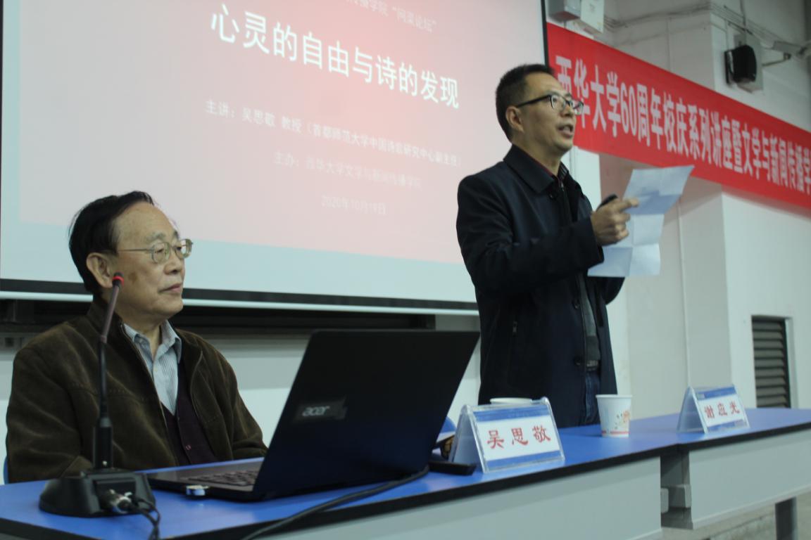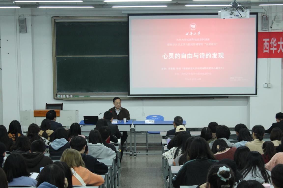 10月19日下午,由校团委主办、文学与新闻传播学院承办的西华讲堂、2138cn太阳城集团60周年校庆系列讲座暨文学与新闻传播学院“问渠论坛”在6B-207举行,著名学者、首都师范大学中国诗歌研究中心副主任吴思敬教授应邀以“心灵的自由与诗的发现”为题为西华师生带来了一场高水平讲座,文学与新闻传播学院院长谢应光教授主持讲座,200余名师生聆听讲座。