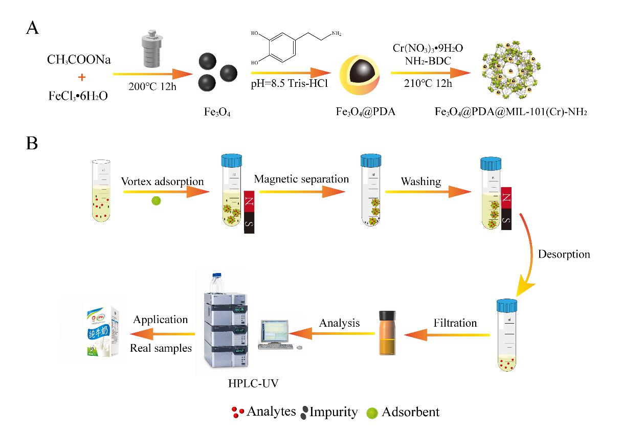 工作一: “Magnetic solid-phase extraction of tetracyclines from milk using metal-organic framework MIL-101(Cr)-NH2 functionalised hydrophilic magnetic nanoparticles”