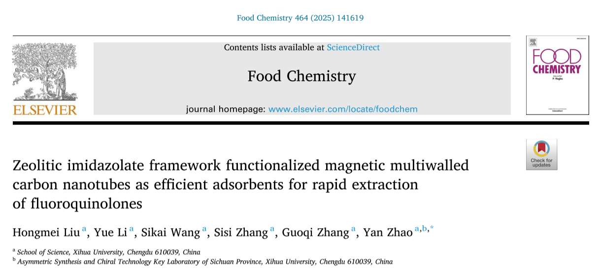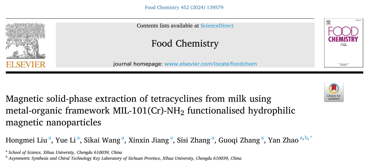 近日,理学院赵艳教授课题组在食品领域TOP期刊Food Chemistry (中科院1区,IF:8.5) 期刊连续发表题为“Magnetic solid-phase extraction of tetracyclines from milk using metal-organic framework MIL-101(Cr)-NH2 functionalised hydrophilic magnetic nanoparticles”和“Zeolitic imidazolate framework functionalized magnetic multiwalled carbon nanotubes as efficient adsorbents for rapid extraction of fluoroquinolones”的研究性论文。第一作者为理学院2022级研究生刘红梅,通讯作者为赵艳教授,2138cn太阳城集团为论文的第一完成单位。
