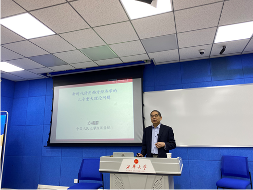 方福前教授的报告会分上下两场。其中,第一场报告会的主题是《新时代借用西方经济学的几个重大理论问题》。围绕这一主题,方福前教授针对西方经济学任课老师们普遍关心的五个问题:创立中国特色社会主义经济学为什么要借鉴西方经济学?如何看待西方经济学中的意识形态?如何看待西方经济学不研究生产关系?如何看待市场调节的自发性、盲目性和滞后性?如何看待“经济人”假说?从理论和现实两个方面,阐明了自己的看法,深厚的学术功力,丰富生动的生活事例,给现场师生们留下了深刻的影响,提供了一堂内容深刻的课程思政示范课。