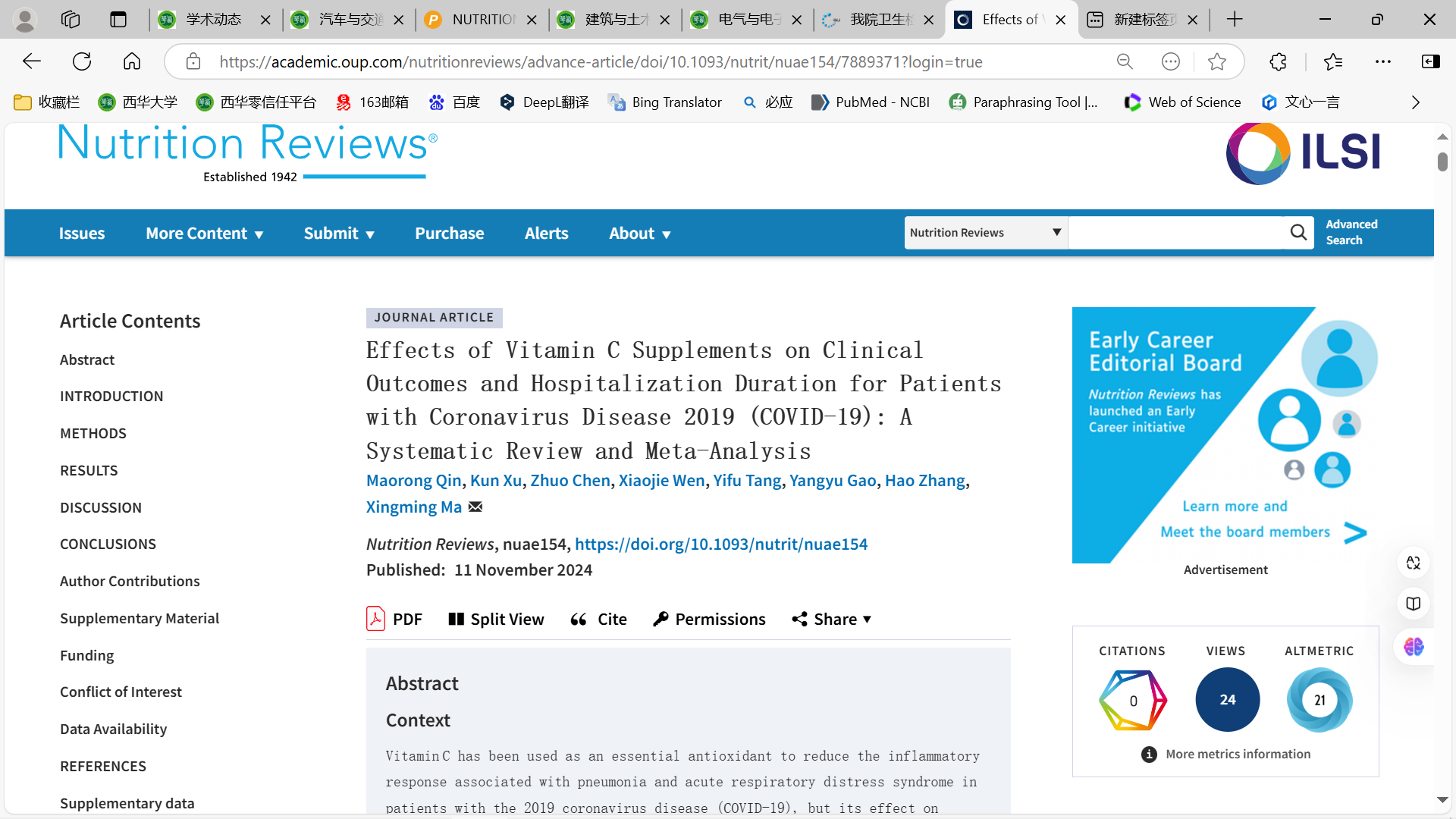 近日,大健康管理学院卫生检验与检疫专业本科生秦茂荣为第一作者、许坤为第二作者,马兴铭教授为通讯作者的论文“Effects of Vitamin C Supplements on Clinical Outcomes and Hospitalization Duration for Patients with Coronavirus Disease 2019 (COVID-19): A Systematic Review and Meta-Analysis”发表于国际知名期刊Nutr Rev,2138cn太阳城集团为论文的第一完成单位和通讯单位。Nutr Rev是由Oxford University Press出版的医学营养学学术刊物,创刊于1942年,为JCR分区1区,中科院SCI大类分区2区,IF=5.9,期刊在所属学科中位列13/114。