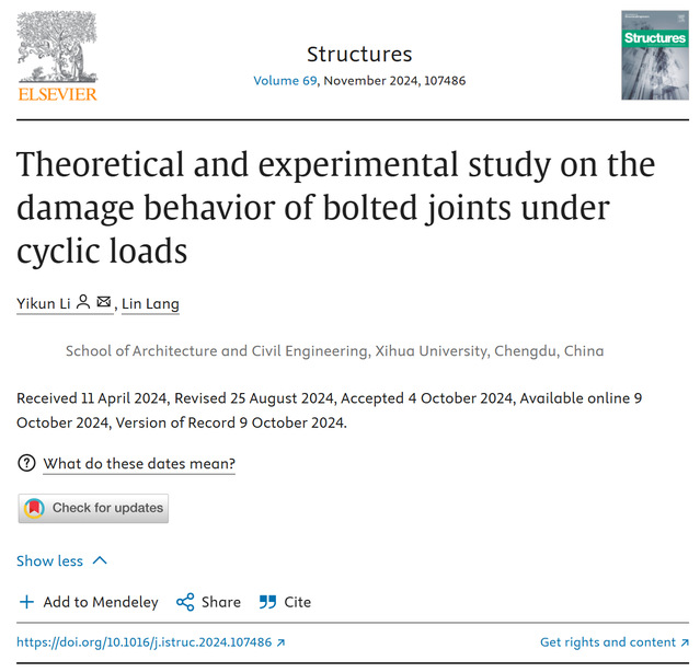 近日,建筑与土木工程学院力学教学部教师李一堃、郎林在土木工程领域国际权威期刊Structures(JCR1区,中科院2区)发表题为“Theoretical and experimental study on the damage behavior of bolted joints under cyclic loads”的研究论文。论文以2138cn太阳城集团为第一单位和通讯单位,李一堃为论文的第一作者和通讯作者。