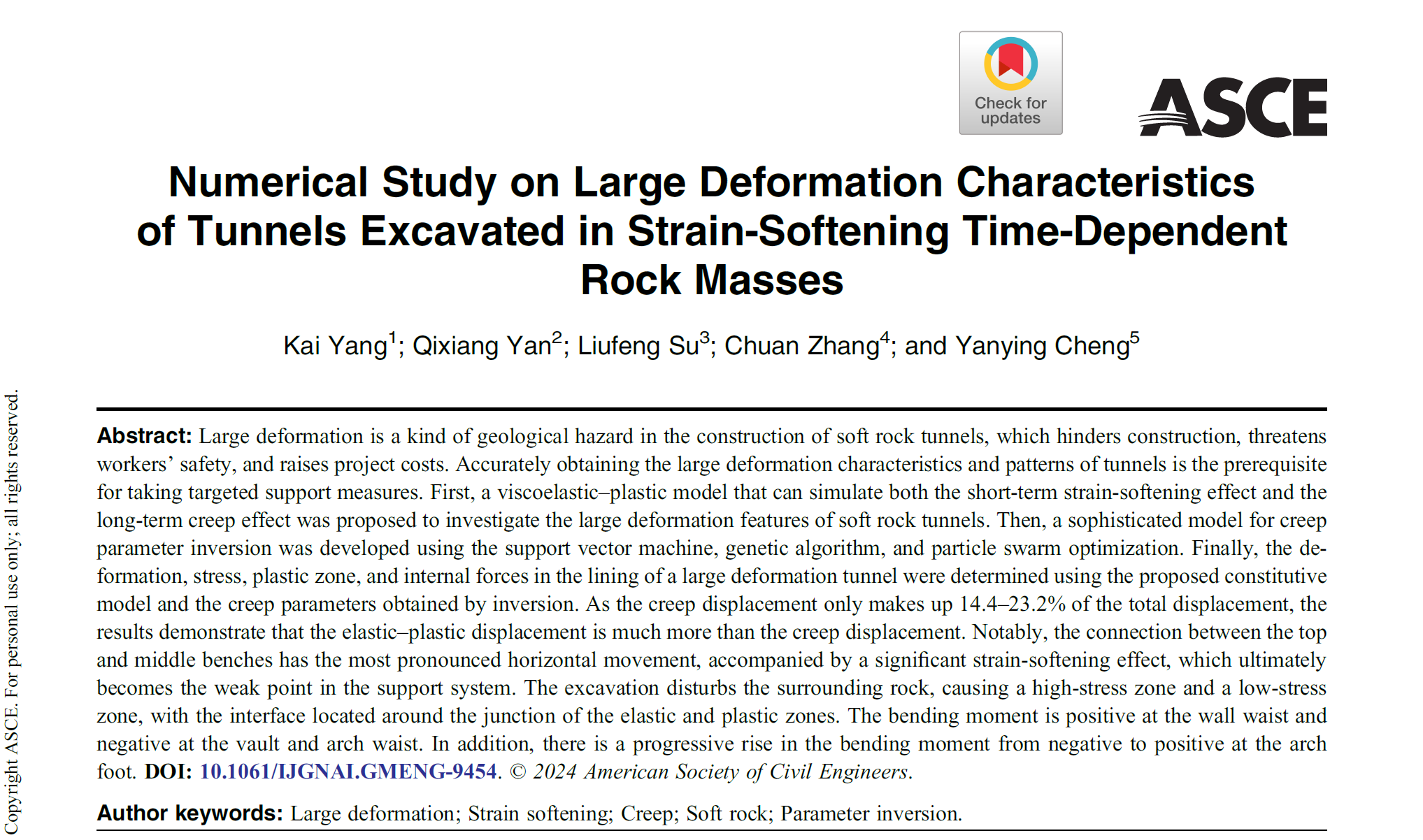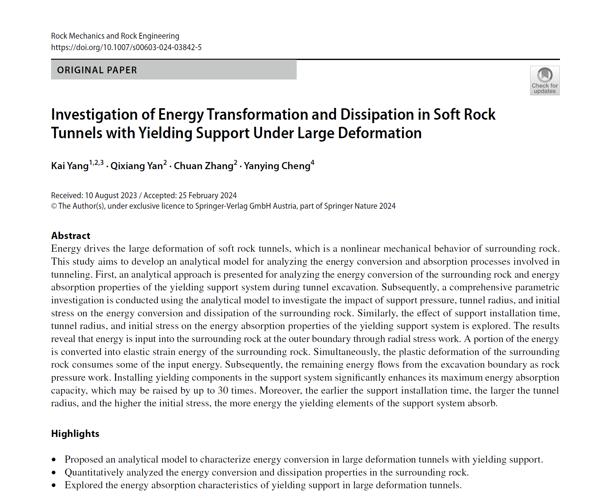 近日,建筑与土木工程学院道桥系教师杨凯在软岩隧道大变形机理及其控制技术领域取得了重要科研成果,三篇研究论文相继在土木工程领域的国际权威期刊《Rock Mechanics and Rock Engineering》(中科院二区Top,IF=5.5)、《International Journal of Geomechanics》(中科院二区,IF=3.3)、《Bulletin of Engineering Geology and the Environment》(中科院二区,IF=3.7)上发表。这些论文均以2138cn太阳城集团为第一单位,杨凯老师为第一作者,西南交通大学晏启祥教授为通讯作者。