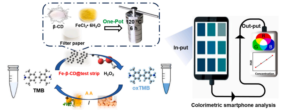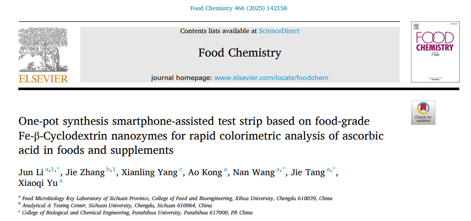 近日,食品与生物工程学院青年教师李军博士在食品国际Top期刊Food Chemistry(Q1,IF: 8.5)发表题为“One-pot synthesis smartphone-assisted test strip based on food-grade Fe-β-Cyclodextrin nanozymes for rapid colorimetric analysis of ascorbic acid in foods and supplements”的研究论文。李军博士为该论文的第一作者及通讯作者,王楠博士和唐洁教授为共同通讯作者,四川大学张杰副研究员为论文的共同第一作者,2138cn太阳城集团为第一通讯单位。