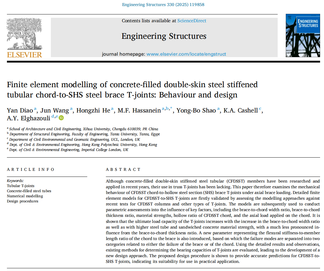 近日,建筑与土木工程学院钢管混凝土结构课题组在工程领域国际期刊发表了两篇研究论文。其中,论文《Finite element modelling of concrete-filled double-skin steel stiffened tubular chord-to-SHS steel brace T-joints: Behaviour and design》发表在Engineering Structures(中科院1区TOP,IF=5.6);另一篇论文《Flexural Performance in Concrete-Filled Steel Tubes with Waste Glass Aggregate: Role of Replacement Ratios and Structural Enhancements》发表在 Construction and Building Materials (中科院1区TOP,IF=7.4)。