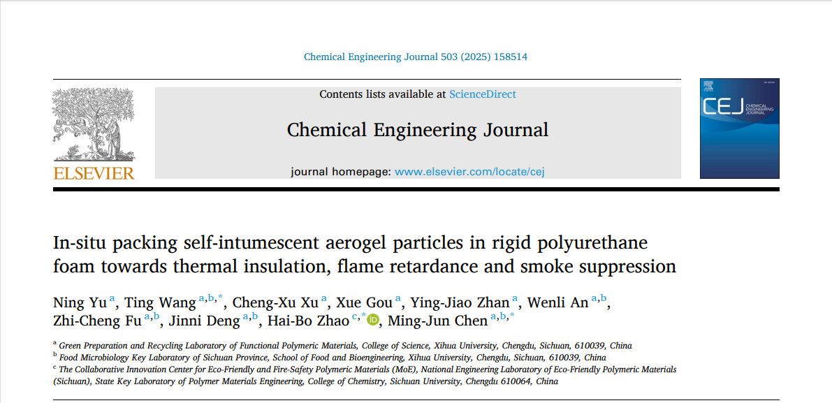 近日,理学院功能高分子材料绿色制备与循环利用研究团队在阻燃保温复合材料研究上取得新进展。相关成果发表在材料领域著名刊物Chemical Engineering Journal(中科院1区TOP,IF: 13.4),第一作者为理学院2025届材料科学与工程专业硕士研究生余宁,通讯作者为汪婷副教授、陈明军教授,以及四川大学赵海波教授,2138cn太阳城集团为该论文的第一完成单位。