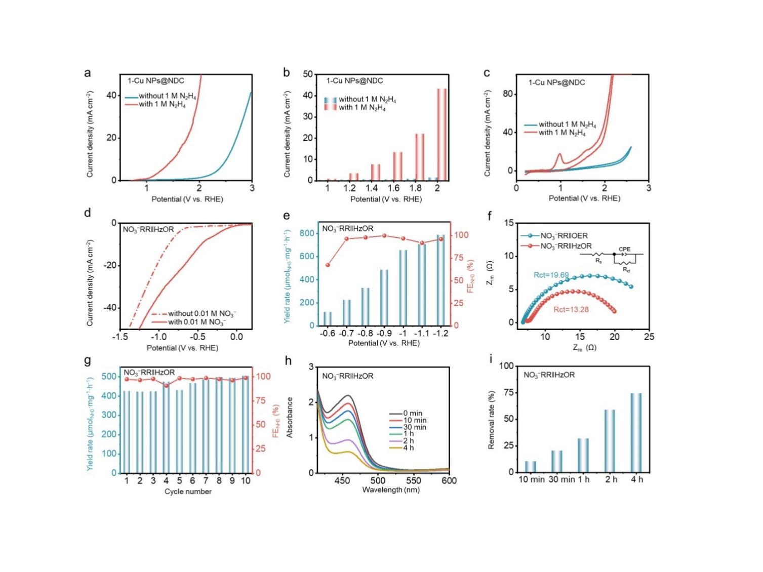 a) 分别在含和不含0.01 M NO3−的0.1 M Na2SO4溶液中,在NO3−RR||OER和NO3−RR||HzOR系统中测试的1-Cu NP @ NDC的LSV曲线。b) 对于NO3−RR||HzOR系统中的电催化NO3−RR,1-Cu NPs@NDC催化剂在不同施加电压下的NH3产率和FENH3。c) 在NO3−RR||HzOR系统中,含0.01M NO3−的0.1 M Na2SO4溶液中,在−0.9 V (vs. RHE)下1-Cu NPs@NDC的阻抗图。d) 在NO3−RR||HzOR系统中进行十次循环测试。e) 不同电解持续时间后,NO3−RR||HzOR系统阳极电解液中N2H4浓度的紫外-可见光谱分析。f) 不同电解持续时间后,NO3−RR||HzOR系统阳极电解液中N2H4的去除率。