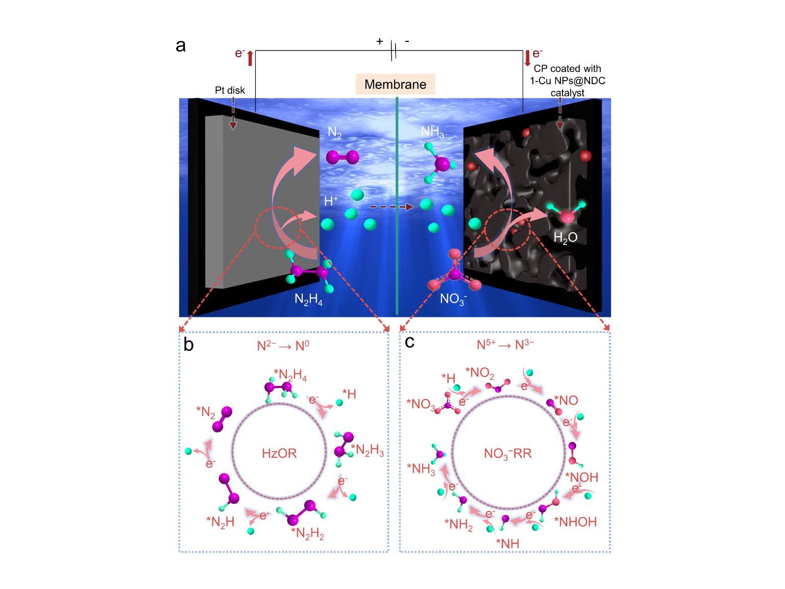 a) 电化学催化NO3−RR||HzOR的反应示意图。b) 电催化N2H4氧化机理图。c) 电催化NO3−还原反应机理图。